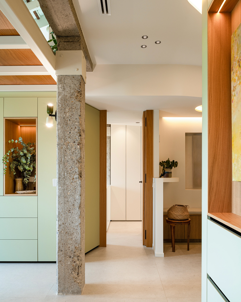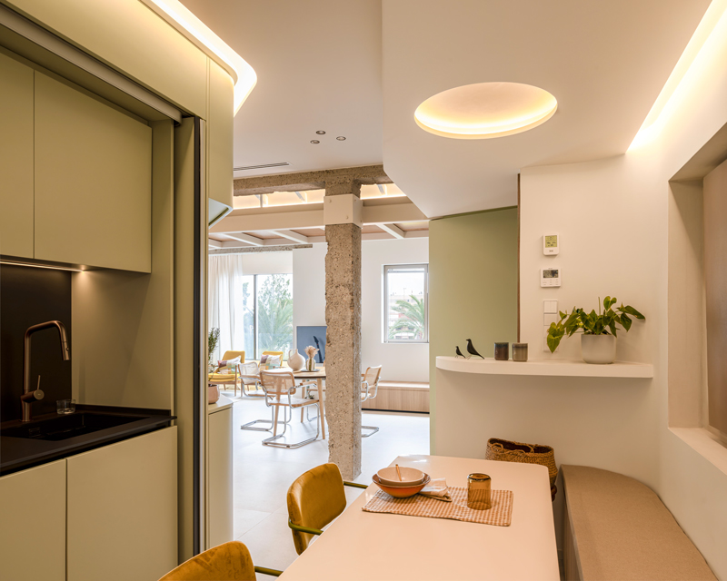 En esta vivienda, cada decisión de diseño se orienta a crear lugares de encuentro y convivencia. Por ello, la cocina escamoteable se ubica en un punto que podría haber sido simplemente de paso y se transforma en un espacio central donde cocinar, leer o trabajar. A su alrededor, una bancada con almacenamiento y una mesa a medida articulan el ambiente. Éste invita a compartir, sintetizando así la filosofía del proyecto: convertir lo cotidiano en una experiencia compartida.